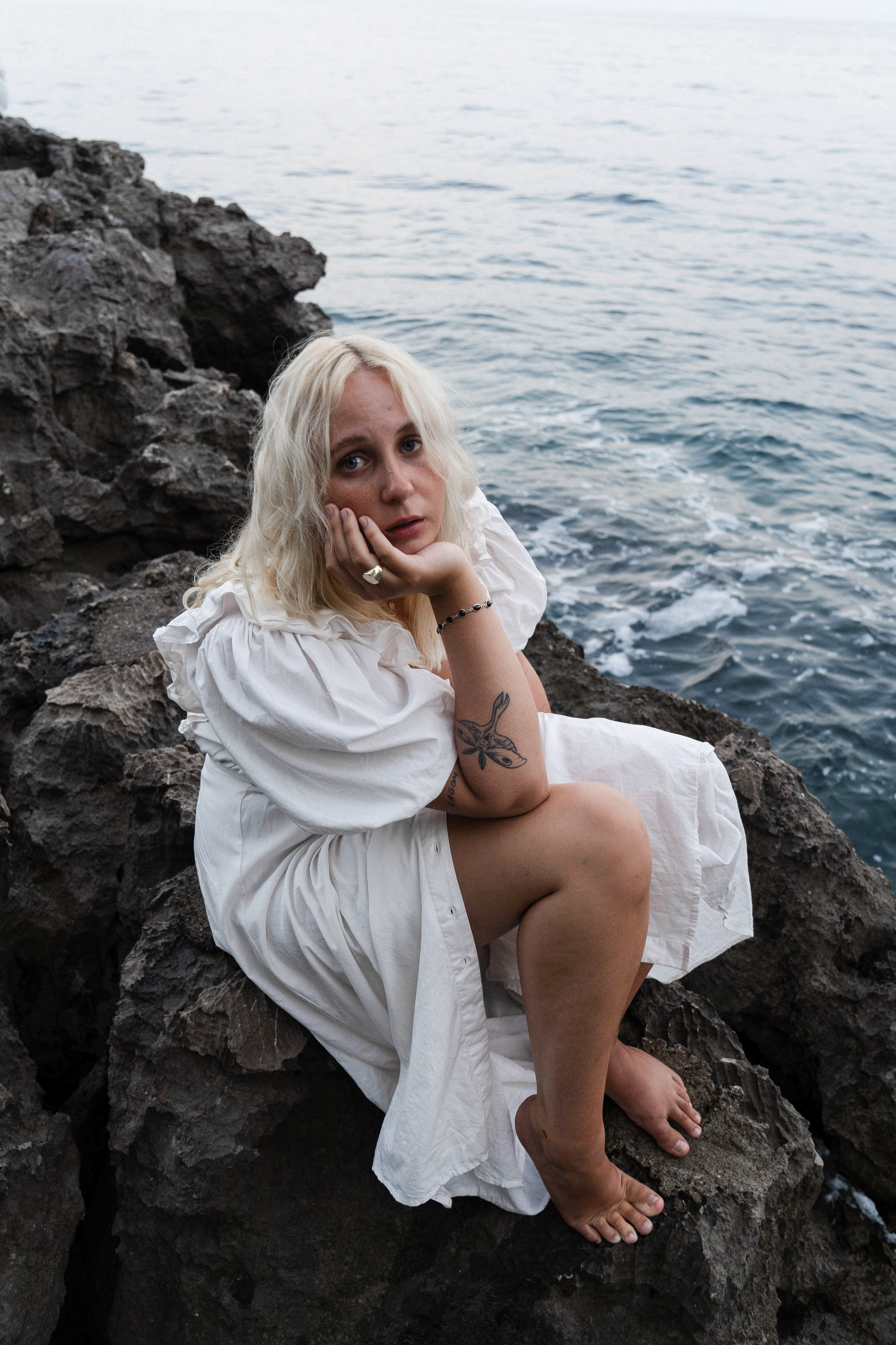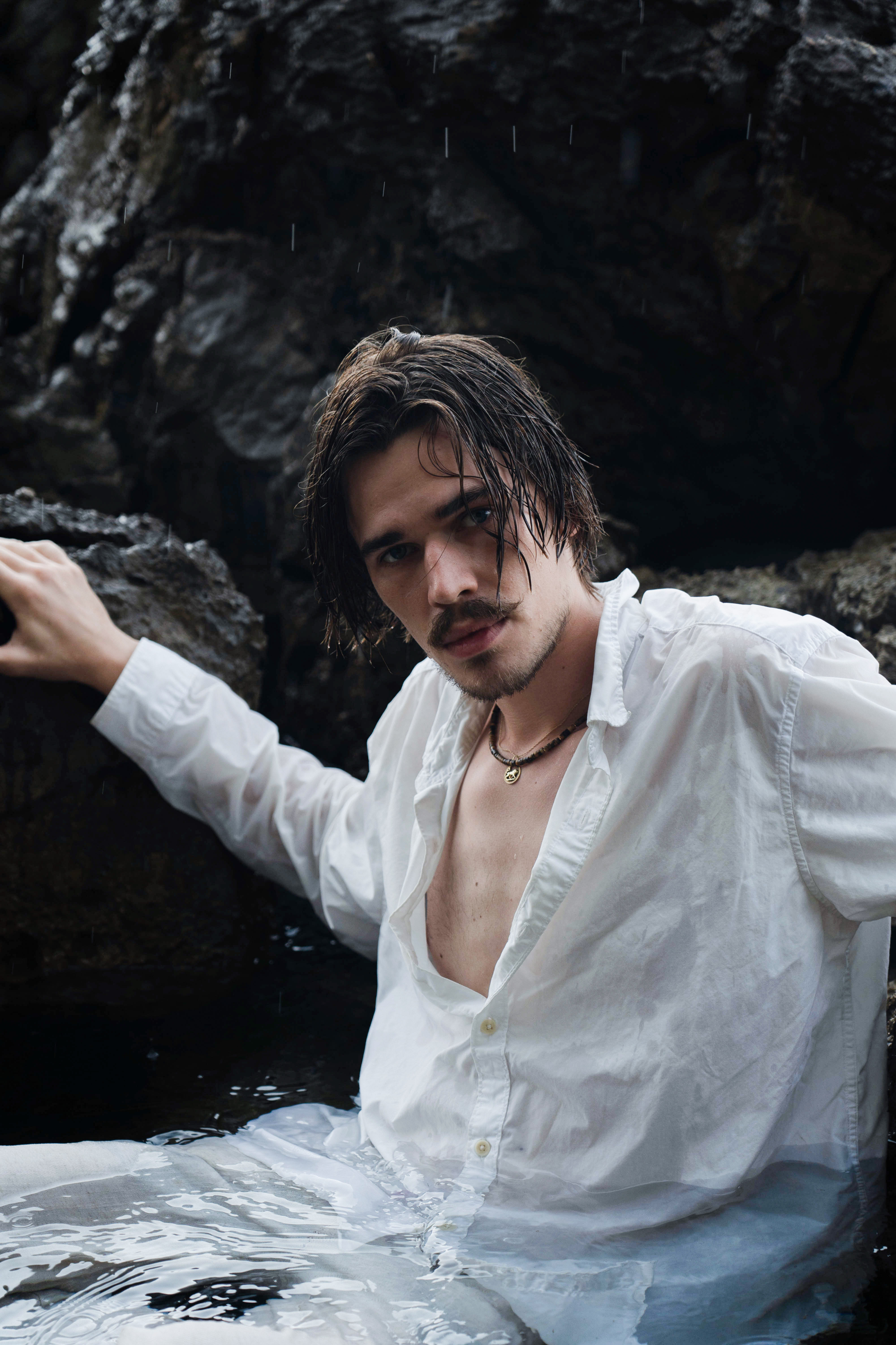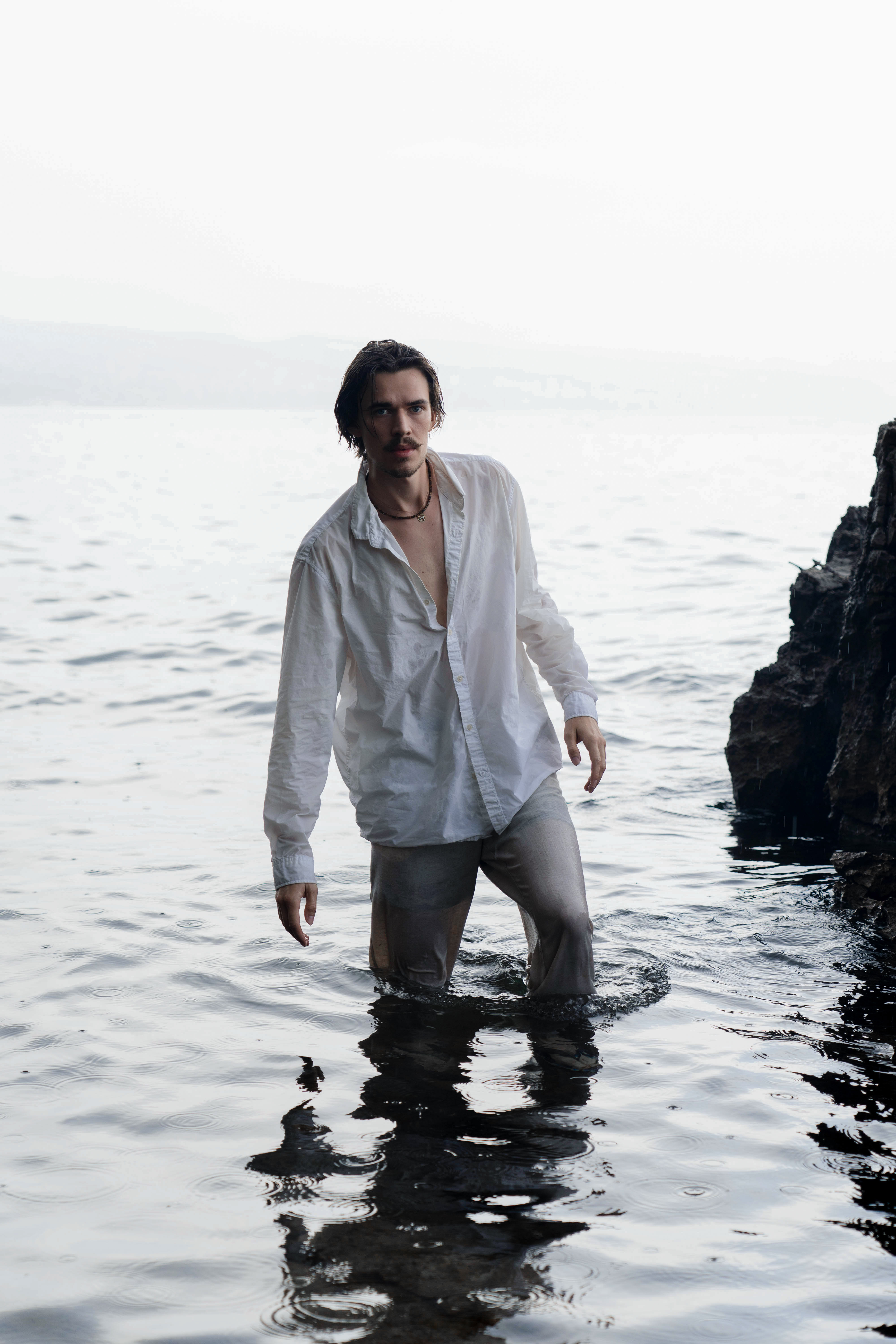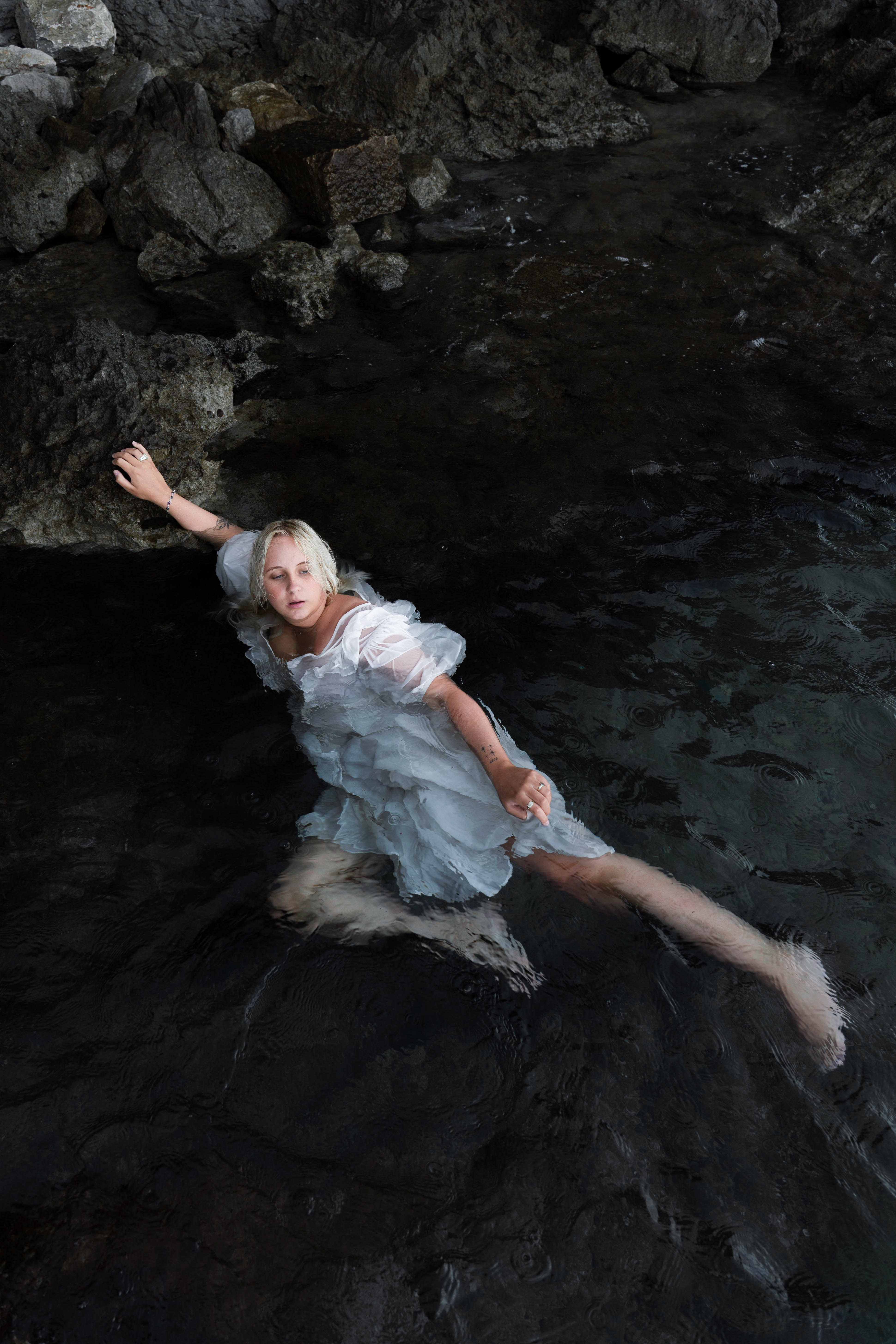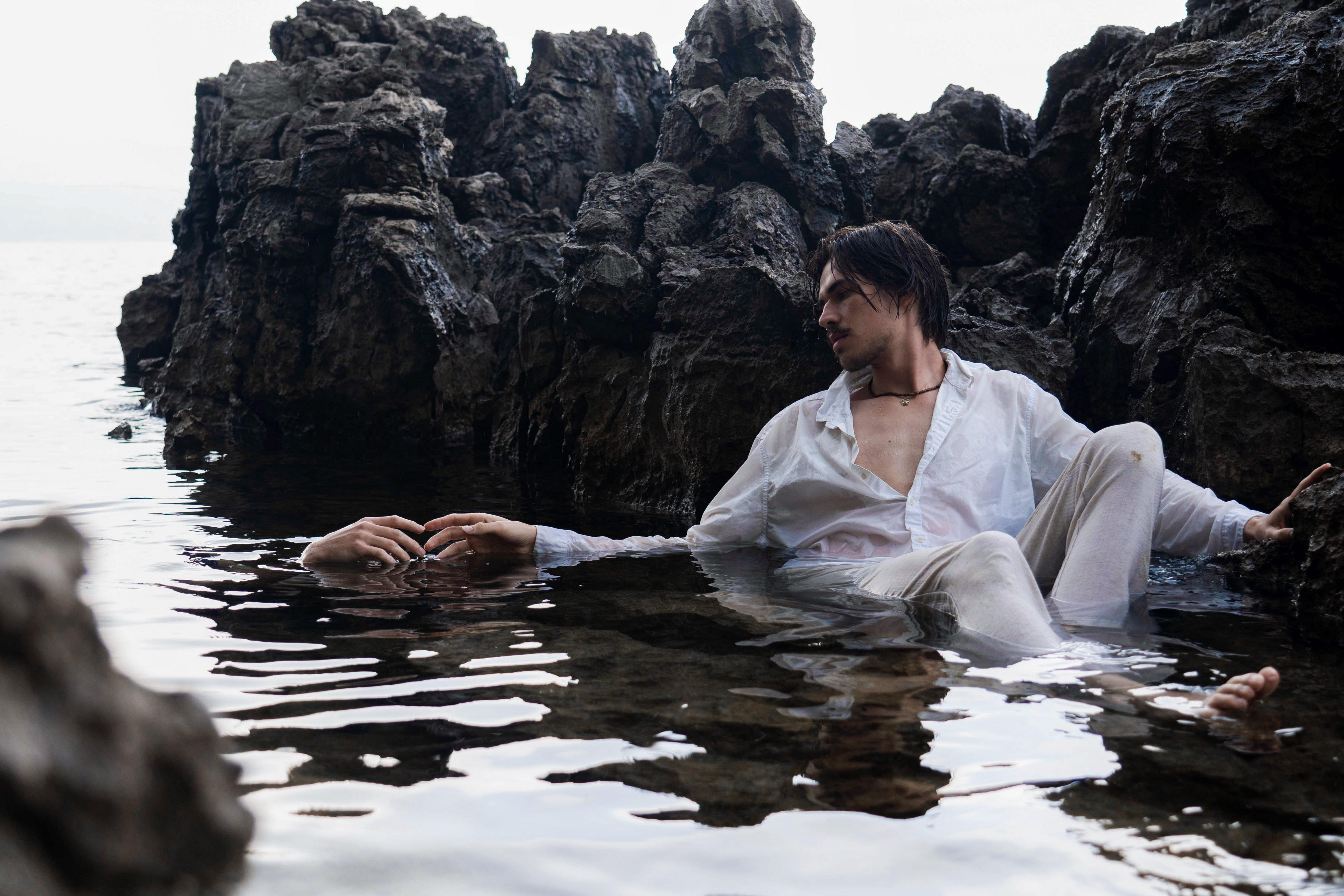Thalassophil [griech. thalassa = Meer, philos = Freund], Bezeichnung für jemanden, der das Meer liebt und bevorzugt an Meeresküsten oder im Meer lebt. Die Nähe zur Natur wird deutlich, indem sich die Figuren am und im Wasser aufhalten. Schönheit und Schrecken liegen nahe beieinander, aber auch weit auseinander. Manchmal vergessen wir die unheimlichen Tiefen des Meeres in Situationen und Menschen, die uns vertraut sind. Der starke Farbkontrast zwischen den dunklen Klippen und dem hellen Himmel unterstützt dies. Um ein fesselndes visuelles Bild zu schaffen, trugen alle Models während der gesamten Serie weiße Kleidung, denn die Farbe Weiß steht für Freiheit und Unendlichkeit.